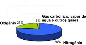 O ar é composto por cerca de 78,1% de Nitrogênio (N2), 20,9% de oxigênio (O2) e 1% de outros gases como o Argônio (Ar), dióxido de carbono (CO2), Hélio (He) entre outros mais.